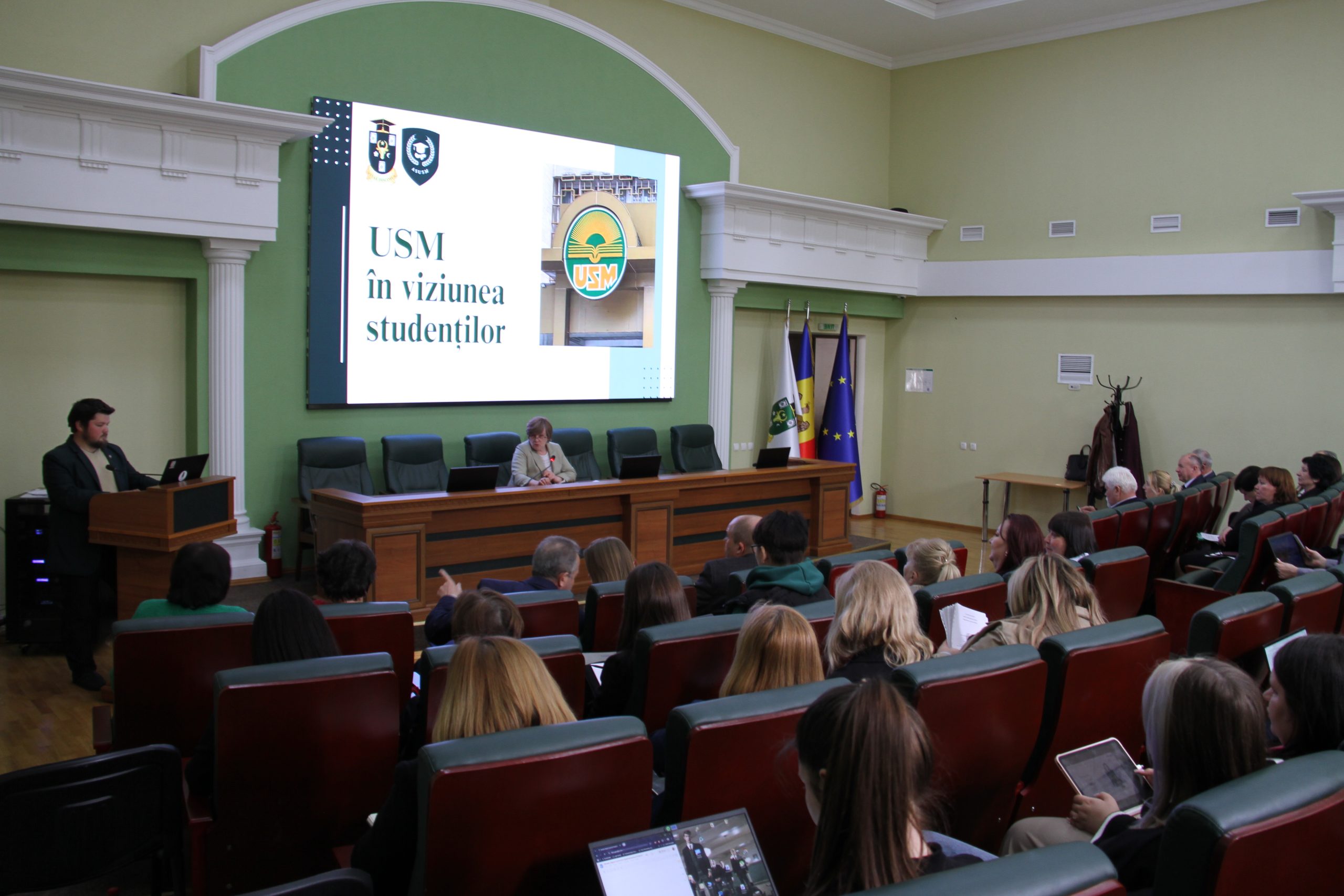 Un prim punct al ședinței a vizat perspectiva studenților asupra mediului universitar, prezentată de Mihalachi Alexandru, Președinte ASUSM. Intervenția a adus în prim-plan modul în care studenții percep oferta educațională, constituind un reper important pentru ajustarea politicilor instituționale în raport cu nevoile tinerilor.